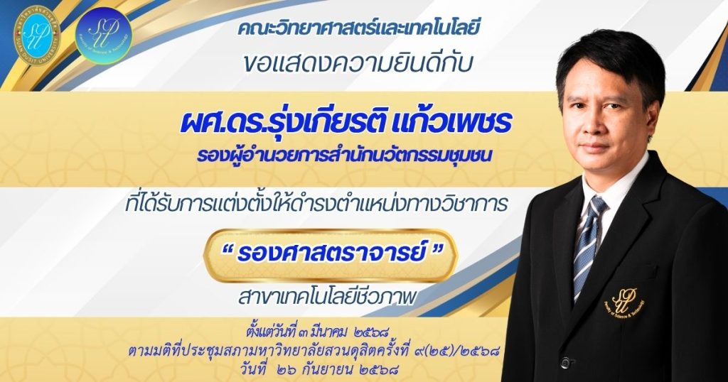 ผศ.ดร.รุ่งเกียรติ แก้วเพชร คณะวิทยาศาสตร์และเทคโนโลยี มหาวิทยาลัยสวนดุสิต รองผู้อำนวยการสำนักนวัตกรรมชุมชนในโอกาสที่ได้รับการแต่งตั้งให้ดำรงตำแหน่งทางวิชาการ “ รองศาสตราจารย์ ” สาขา เทคโนโลยีชีวภาพ ตั้งแต่วันที่ ๓ มีนาคม ๒๕๖๘