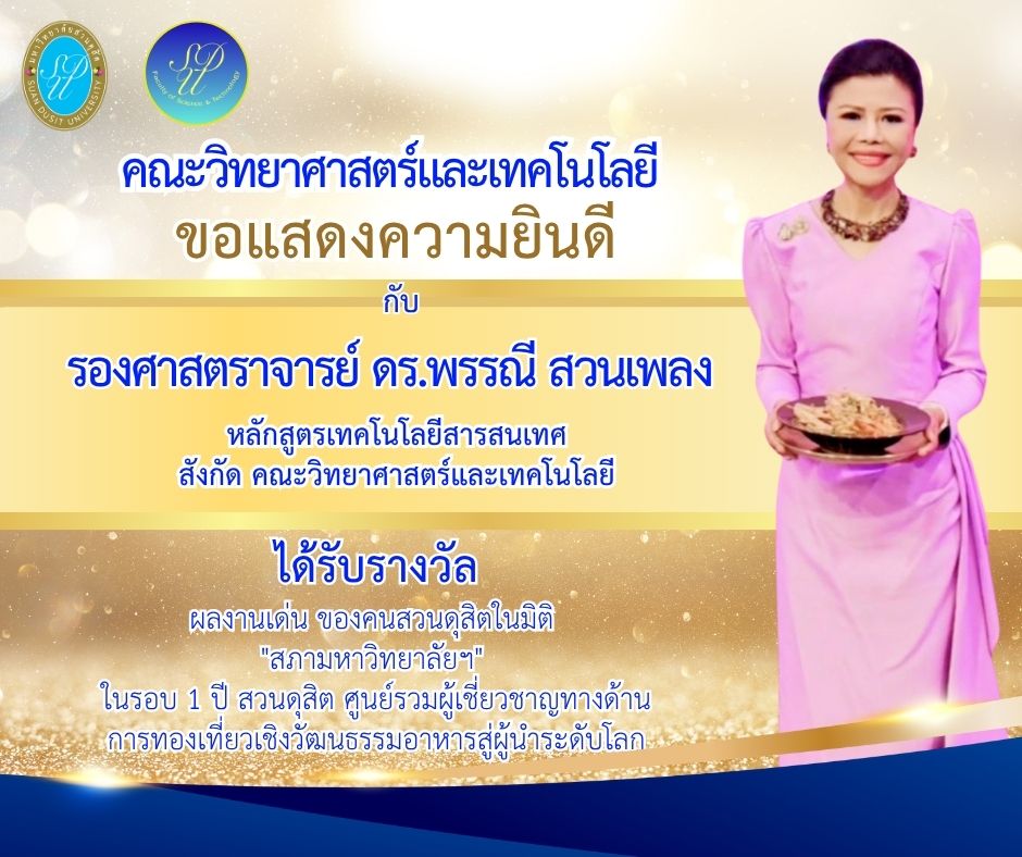 คณะวิทยาศาสตร์และเทคโนโลยีขอแสดงความยินดี กับ รองศาสตราจารย์ ดร.พรรณี สวนเพลง หลักสูตรเทคโนโลยีสารสนเทศ สังกัด คณะวิทยาศาสตร์และเทคโนโลยี ได้รับรางวัลผลงานเด่น ของคนสวนดุสิตในมิติ “สภามหาวิทยาลัยฯ” ในรอบ 1 ปี สวนดุสิต ศูนย์รวมผู้เชี่ยวชาญทางด้านการท่องเที่ยวเชิงวัฒนธรรมอาหารสู่ผู้นำระดับโลก