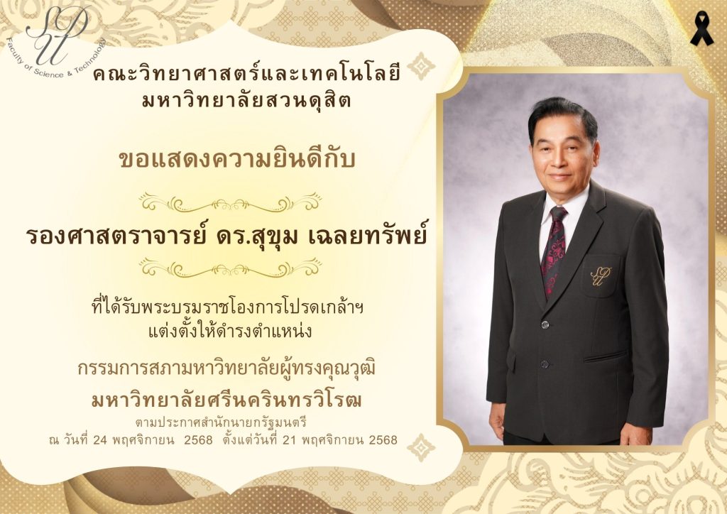 คณะวิทยาศาสตร์และเทคโนโลยี มหาวิทยาลัยสวนดุสิตขอแสดงความยินดีกับรองศาสตราจารย์ ดร.สุขุม เฉลยทรัพย์Nov 27, 2025anuchitกิจกรรม, ข่าวประชาสัมพันธ์ ที่ได้รับพระบรมราชโองการโปรดเกล้าฯแต่งตั้งให้ดำรงตำแหน่งกรรมการสภามหาวิทยาลัยผู้ทรงคุณวุฒิมหาวิทยาลัยศรีนครินทรวิโรฒ ตามประกาศสำนักนายกรัฐมนตรี ณ วันที่ 24 พฤศจิกายน 2568 ตั้งแต่วันที่ 21 พฤศจิกายน 2568 Share this… Facebook Line Pinterest Twitter Linkedin