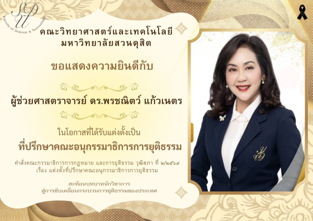 คณะวิทยาศาสตร์และเทคโนโลยีมหาวิทยาลัยสวนดุสิตขอแสดงความยินดีกับ ผู้ช่วยศาสตราจารย์ ดร.พรชณิตว์ แก้วเนตรในโอกาสที่ได้รับแต่งตั้งเป็น ที่ปรึกษาคณะอนุกรรมาธิการการยุติธรรม