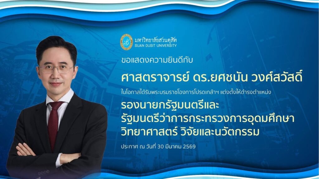 คณะวิทยาศาสตร์และเทคโนโลยี มหาวิทยาลัยสวนดุสิต ขอแสดงความยินดี รองศาสตราจารย์ ดร.ยศชนัน วงศ์สวัสดิ์ ได้รับพระบรมราชโองการโปรดเกล้าฯแต่งตั้งให้ดำรงตำแหน่ง รองนายกรัฐมณตรีและรัฐมณตรี ว่าการกระทรวงการอุดมศึกษาวิทยาศาสตร์และ วิจัยและนวัตกรรมMar 31, 2026anuchitกิจกรรม, ข่าวประชาสัมพันธ์ รองศาสตราจารย์ ดร.ยศชนัน วงศ์สวัสดิ์ ได้รับพระบรมราชโองการโปรดเกล้าฯแต่งตั้งให้ดำรงตำแหน่ง รองนายกรัฐมณตรีและรัฐมณตรี ว่าการกระทรวงการอุดมศึกษาวิทยาศาสตร์และ วิจัยและนวัตกรรม Share this… Facebook Line Pinterest Twitter Linkedin