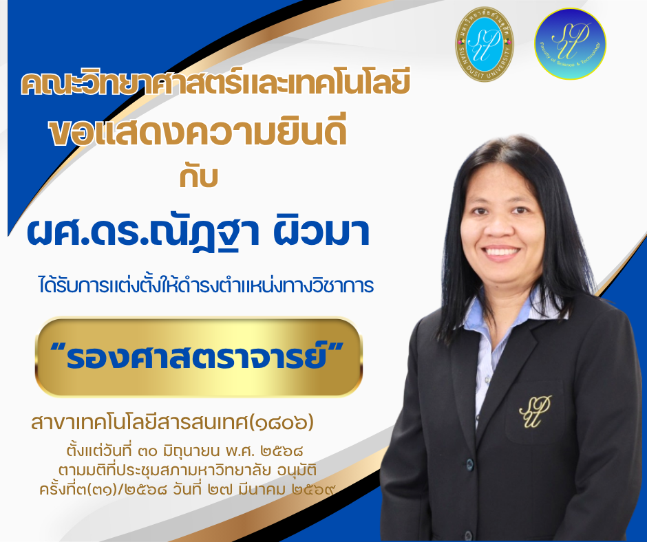 คณะวิทยาศาสตร์และเทคโนโลยี ขอแสดงความยินดี กับผศ.ดร.ณัฏฐา ผิวมา ได้รับการแต่งตั้งให้ดำรงตำแหน่งทางวิชาการ “รองศาสตราจารย์” สาขาเทคโนโลยีสารสนเทศ(๑๘๐๖)ตั้งแต่วันที่ ๓๐ มิถุนายน พ.ศ. ๒๕๖๘ ตามมติที่ประชุมสภามหาวิทยาลัย อนุมัติ ครั้งที่๓(๓๑)/๒๕๖๘ วันที่ ๒๗ มีนาคม ๒๕๖๙