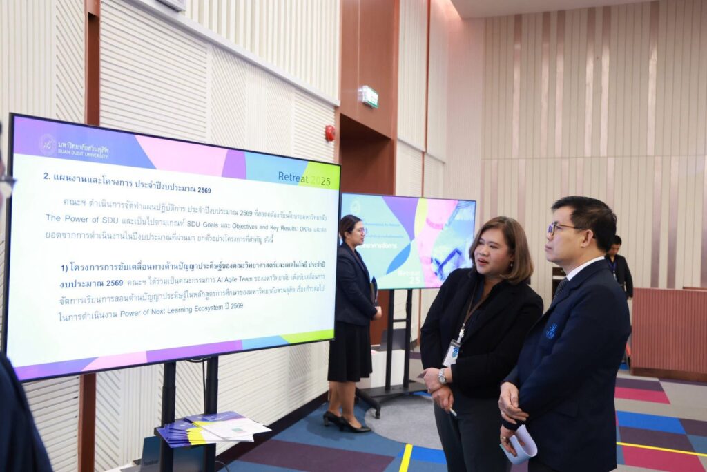 ผศ.ดร.ฐิตินาถ สุคนเขตร์คณบดี และดร.รังสันต์ จอมทะรักษ์ ผู้ช่วยคณบดี คณะวิทยาศาสตร์และเทคโนโลยี ร่วมการประชุม Retreat ประจำปี 2568 โดยกรรมการสภามหาวิทยาลัย เพื่อทบทวนผลการดำเนินงานของทุกหน่วยงานในมหาวิทยาลัย และพัฒนาการบริหารจัดการให้มีประสิทธิภาพ โดยเฉพาะการได้รับฟังความคิดเห็นจากนักศึกษา ทำให้ได้ทบทวนการทำงานของคณะฯ